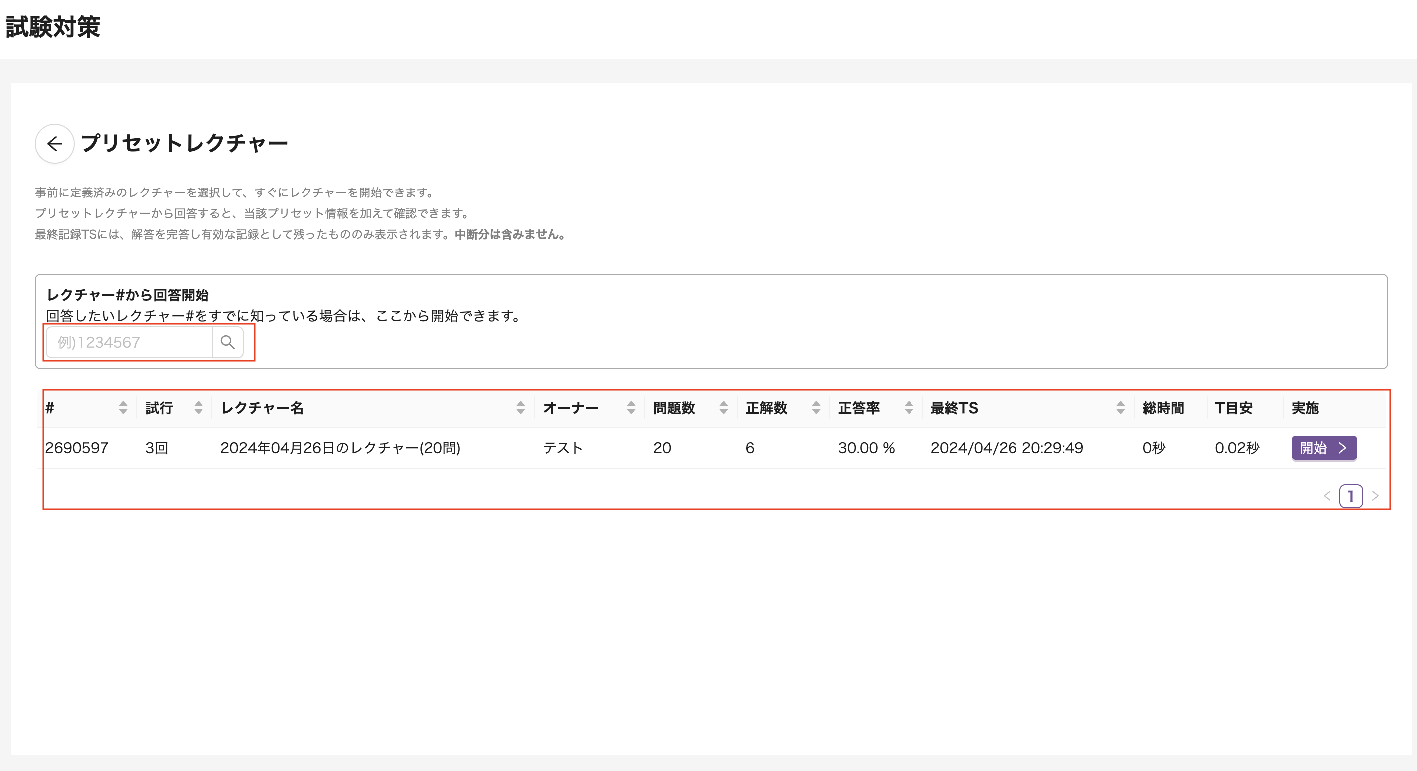 レクチャーの一覧表とレクチャーIDの入力欄が表示されます。