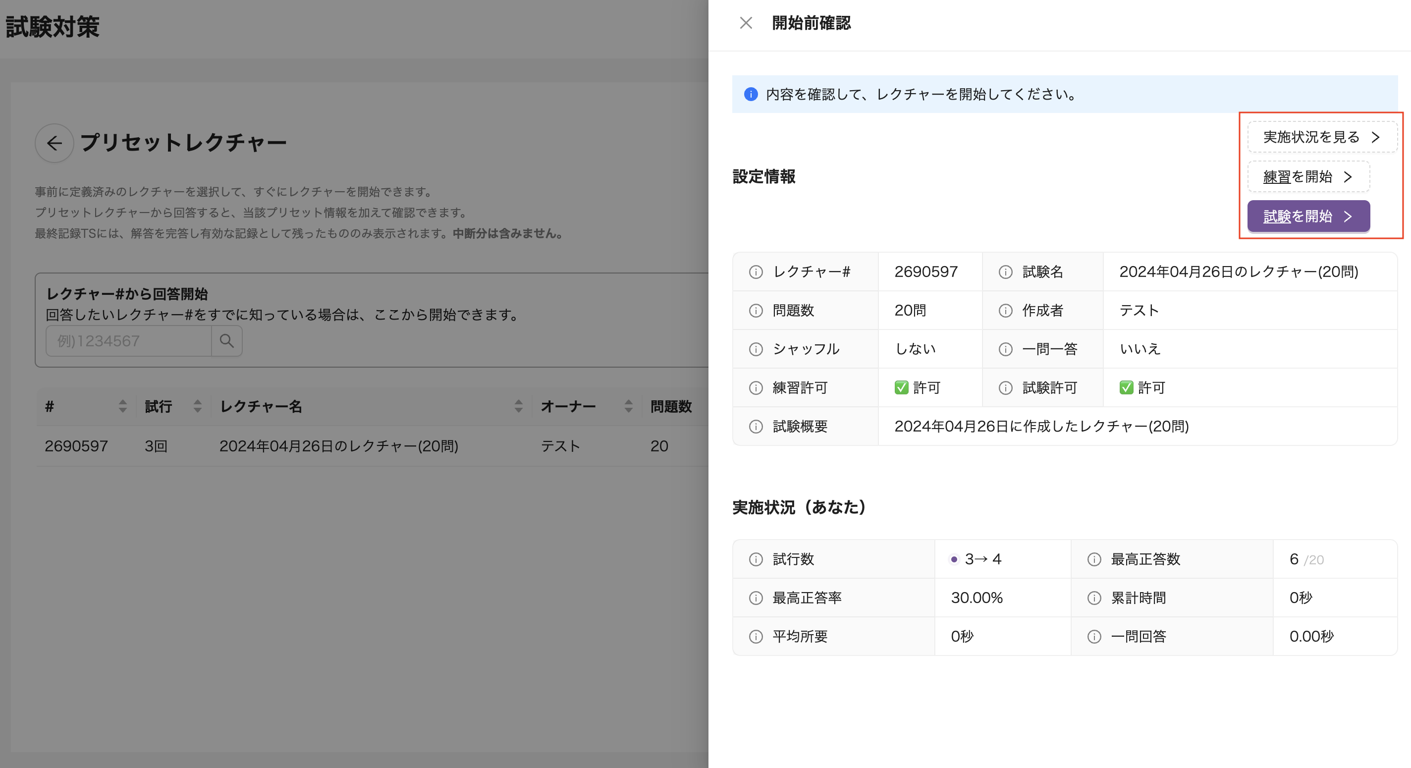 選択したレクチャーの概要が表示されます。 赤枠内「模試の開始」を押して、模試を開始しましょう。
