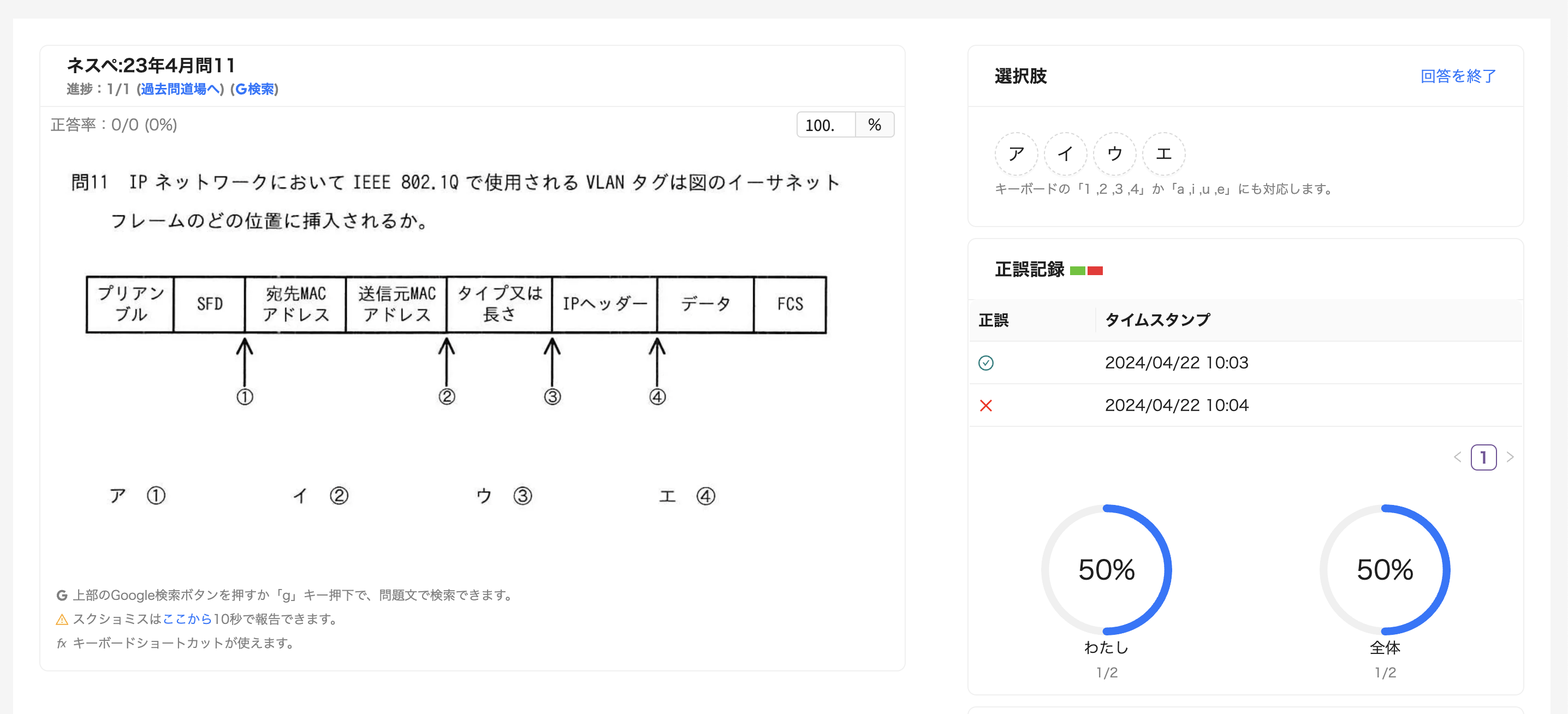 レクチャー終了後は、このように成果が表示されます。 必要に応じて振り返りを実施してください。 出題画面2