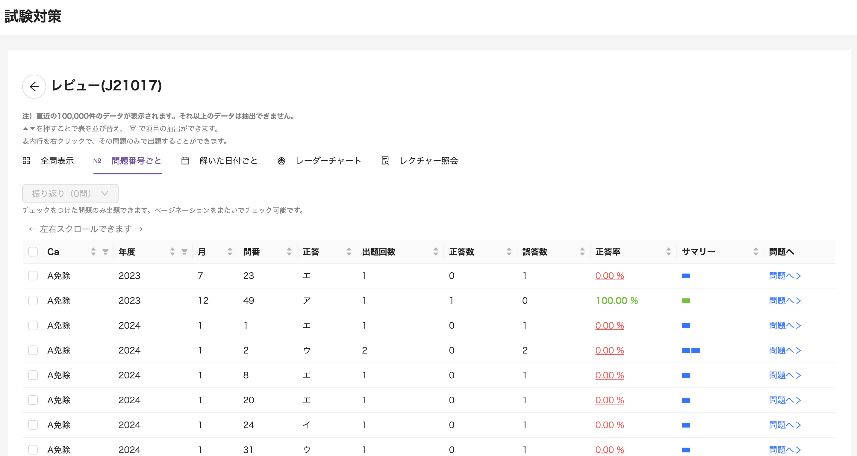 現在、問題番号毎の振り返りにおいて表内項目を並び替えられない事象(上図「振り返り画面の見方ー項番(4)」を操作する場合)を確認しています。