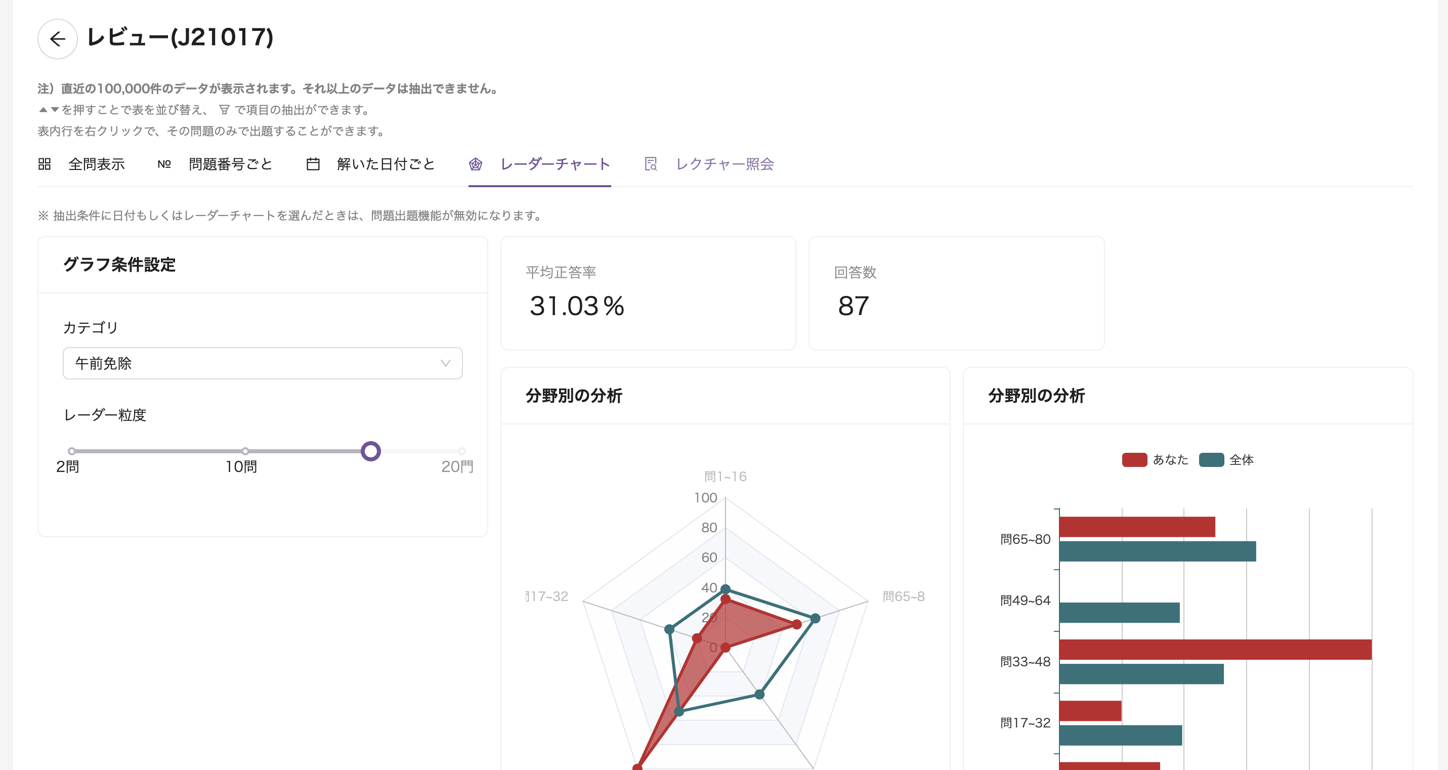 レーダーチャートで表示します。 レーダーチャートは、問題のカテゴリ毎に抽出しそのカテゴリ内の問題番号毎に正答率を表示します。