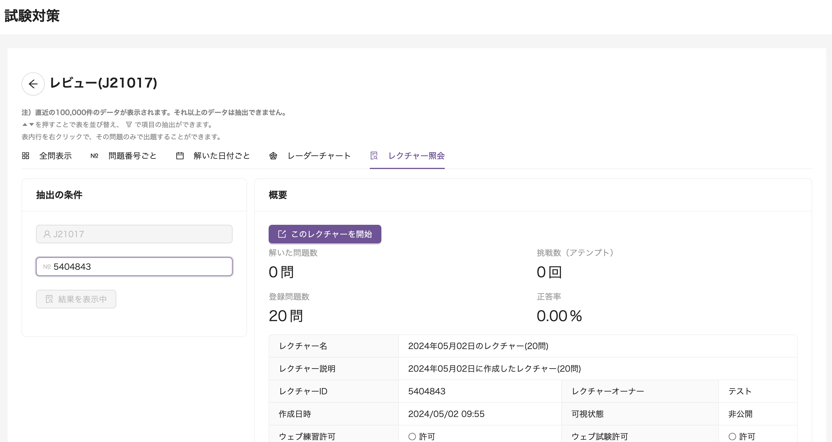 レクチャーIDからレクチャーを照会できます。 (次の「問題の詳細画面」からも、レクチャーに対して回答している場合この画面へ自動遷移できます。)